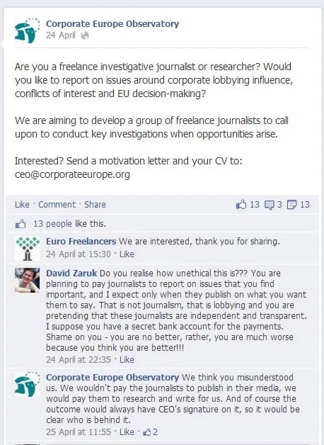 Corporate Europe Observatory is not at all ashamed that they are using much of their excess bank balance (they have more than €675,000 a year) to buy off journalists to write reports for them. It is desperate times for journalists as the media world adapts to an evolving landscape, so CEO can easily challenge their ethical standards. CEO blatantly advertise for journalists (see screenshot below) and even directly employ them (while letting them continue to pretend to be journalists – see bottom of email chain: Leloup-Mack-08032010). Like most things that Corporate Europe Observatory does, I find this behaviour to be totally disgraceful.