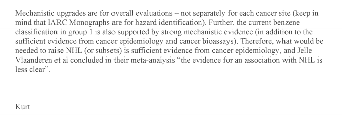 When an IARC official has to remind a scientist that they only do hazard assessments and that the main meta-analysis did not find any evidence to clearly link NHL to benzene, then it is pretty safe to say there is no scientific support for a further monograph.