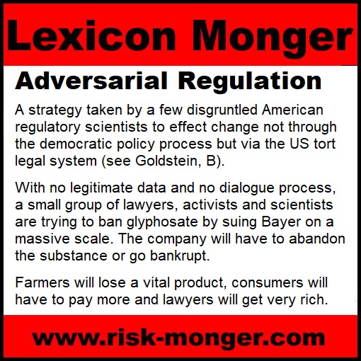 Bernie was right. If all you want to do is win, then adversarial regulation is far more effective. The greed of the American tort industry is presently gorging itself on the carcass of the chemical industry and it will only be a matter of time before bankruptcy or a settlement ensues. The lawyers and litigation consultants will get their money (it was never about the plaintiffs so they won’t receive much for their services). Jobs will be lost, innovations abandoned and the public outrage toward industry and technology will harden. Farmers will lose good tools and consumers will pay more for lower quality produce. The environment will suffer as more meadows and forests are ploughed under. But Bernie’s strategy will win and the gameplan will be re-set for the next greedy band of zealots.