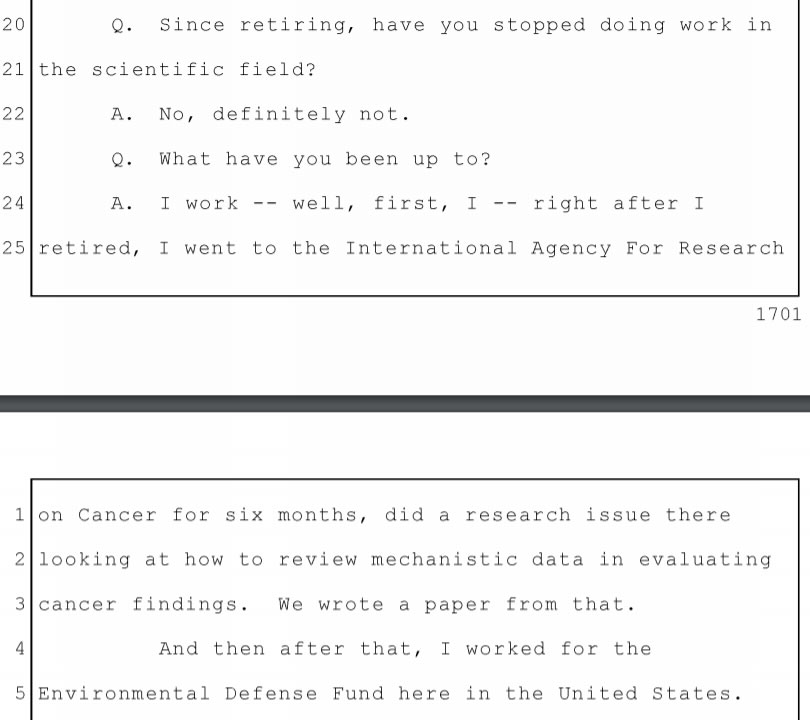 A few lies spread by Portier regarding this timeline need to be dispelled. In his Johnson testimony, Portier said under oath that he worked at the Environmental Defense Fund (EDF) after his time as a visiting scientist at IARC (see image). This is false. Portier claimed his EDF work did not involve pesticides and thus was not a conflict of interest. This is false. The EDF wristband project worked with 12 pesticides. He also said in his Daubert deposition he was an invited specialist on Monograph 112 (on glyphosate) because of his conflict of interest with EDF. This is also false. He informed the Monograph 112 Working Group of his affiliation at the start of the meeting (the initial meeting convocation did not list this NGO affiliation). In any case, IARC would not consider this a conflict of interest since he chaired the IARC Advisory Panel with the same affiliations.