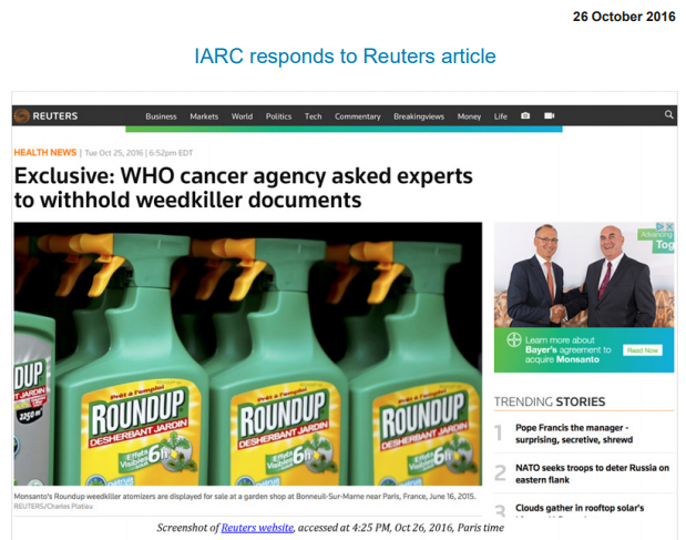 Poor IARC. Or maybe not. See how irresponsible IARC behaved in the presentation of their response to the Reuters article. At the very top of their press statement they offer a screenshot suggesting the Reuters article was paid by, yes, Monsanto.