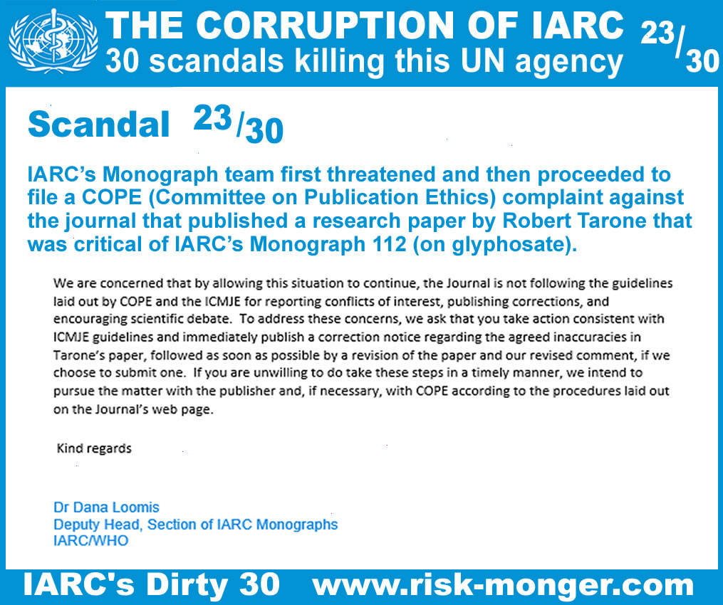 The Risk-Monger has been investigating corruption scandals in IARC since the WHO’s cancer research agency’s outrageous Monograph 112 on glyphosate was published in 2015. Over the last four and a half years he has published 35 articles on how IARC used poor science, lied, bullied scientists and agencies who challenged them, worked with an army of anti-industry, anti-science (feral) journalists and activists to attack their opponents. He has revealed how IARC allowed scientists having a direct relationship with US tort law firms to serve on working group panels (and even dictate which substances IARC needed to do monographs on to increase lawsuit payouts).