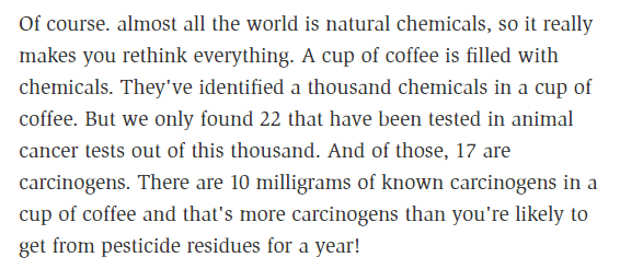 The achievements of the pesticide industry over the last 70 years is indicative of how ALARA can reduce exposures to hazardous chemicals to a very low level. The first goal of crop protection is to provide sufficient harvest to feed a population’s needs as insects, weeds and a variety of fungal diseases continuously threaten those yields. The second goal is to ensure performance while continually reducing the toxic exposure to the environment, the farmer and the consumer. In the 1950s and 60s the chemical loads were far higher than those used today. We are now at a point where the total level of carcinogens on food residues (MRLs) of a year’s consumption of fruit and vegetables is less than the carcinogens consumed in a single cup of coffee. That strikes me as a reasonable achievement.