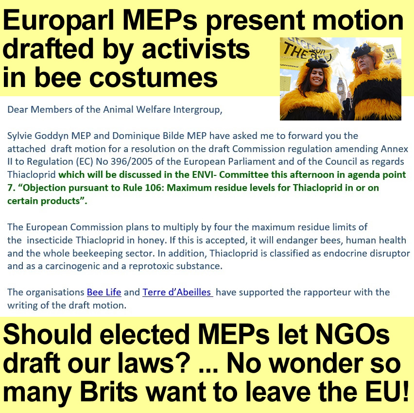 It is not uncommon for NGOs to draft European Parliament resolutions (see image of an earlier example on the activist Save-the-Bees campaign). In the EP’s Chemical Strategy for Sustainability document, it is clear that much of the text was drafted by the endocrine disruption NGO lobby. Doesn’t anybody see a conflict of interest in this? What would happen if Exxon-Mobil were charged with drafting legislation on climate and energy? Where is the outrage or are we all hypocrites? Where was the media to expose this, to scrutinise our leaders, to ensure the European public is well represented? Being on holiday in July is no excuse (NGOs do their worst damage to society and the environment when no one is watching them).