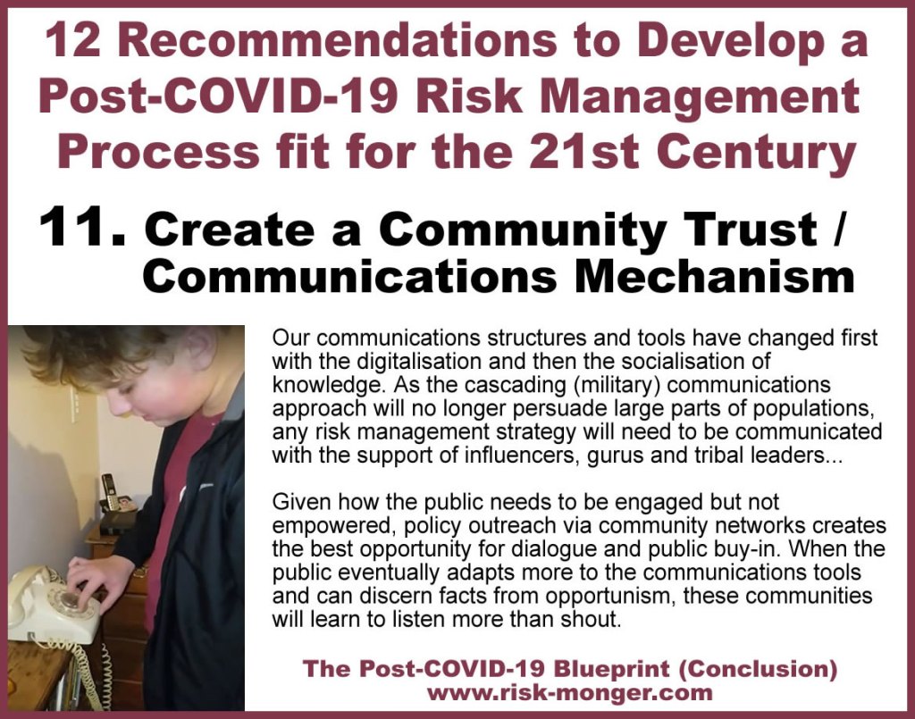 After the disastrous COVID-19 precautionary lockdowns, I articulated a blueprint to return our Western governance process to risk management (in what was perhaps my most ambitious project). Recommendation 11 sought to develop a “community trust / communications mechanism”.
