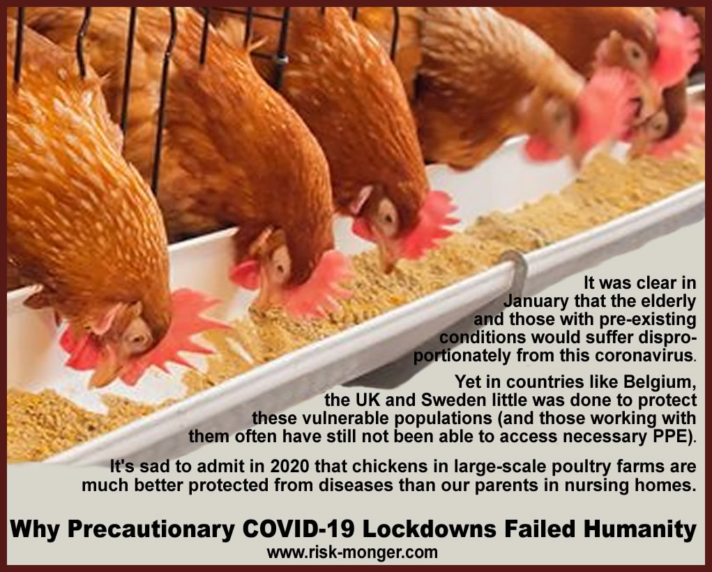 Farmers are born risk managers waking up every day to challenges threatening their livelihoods. A livestock farmer knows how to prevent a herd from infection and takes the necessary risk reduction measures to protect them. Isn’t it a sad indictment that our Western leaders treat their elderly population (the “Great Generation” that fought in World War II) with less respect than farmers treat their cows, pigs and chickens?