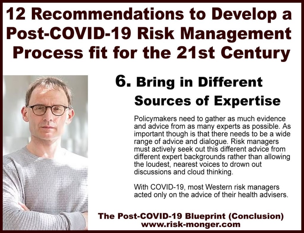 Policymakers regularly commit the fatal mistake of taking advice only from those people who will tell them what they want to hear. They want a clear consensus they can use (lean on) to justify an easy decision-making process. The BSE (mad cow) crisis in the UK is an excellent case study in the consequences of limiting your scientific advice and the lost trust such mistakes could entail. In the 1990s, the British authorities decided (wrongly) to consider only the advice against culling the herd (and the rest was history). Decades after, the British public still does not highly respect or trust government advisers (and UK beef consumption never recovered). The conclusion from that debacle is that scientific advisory groups need to have a diversity of scientific fields to provide comprehensive data and scenarios to allow for informed risk management decisions.