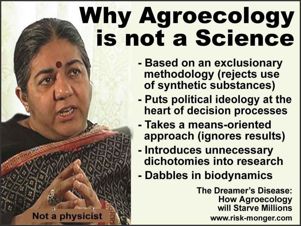 Many in the organic lobby have pinned their colours onto the agroecology mast. While there are many definitions and standards for agroecology (including some non-organic techniques), the reactions against large, intensive farming, corporate involvement and the globalisation of the food chain has defined it mainly as a social justice movement. The call for social justice in developing countries includes a plea to promote organic practices among smallholders and subsistence farmers. Given that most poor smallholders are organic by default, the only thing the agroecology/organic movement is doing is giving a small amount of funding and advice without the means to lift peasant farmers out of poverty. Agroecology here is more of a political ideology of agriculture, with many well-known activists like Vandana Shiva claiming it as their own. It adds a political dimension to the radical organic wing (while impoverishing farmers).