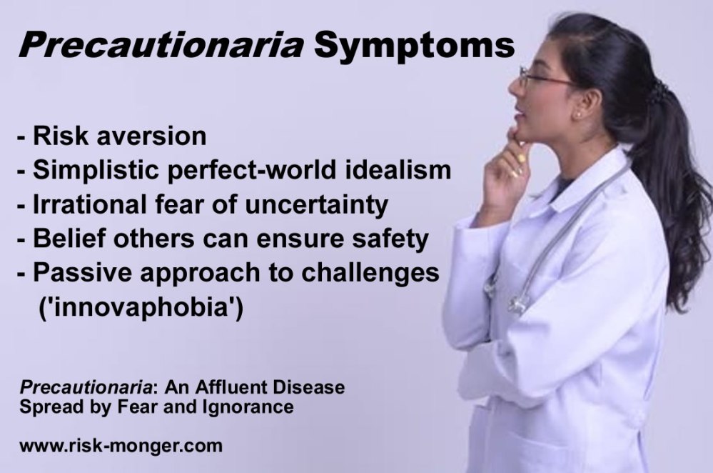 The precautionary principle appeals to an ideologue’s view of the world, unwilling to settle for anything less than perfect. Under the European Environment Agency’s version of precaution (the reversal of the burden of proof), if a technology, substance or product cannot not be proven to be safe, precaution must be taken. Safe and certain are absolutes and advocates have been quick to call for precaution for miniscule exposures to suspected hazards (see the whole endocrine disruption campaign). Actual evidence or reason are not necessary to justify moral-based, ideological decisions.