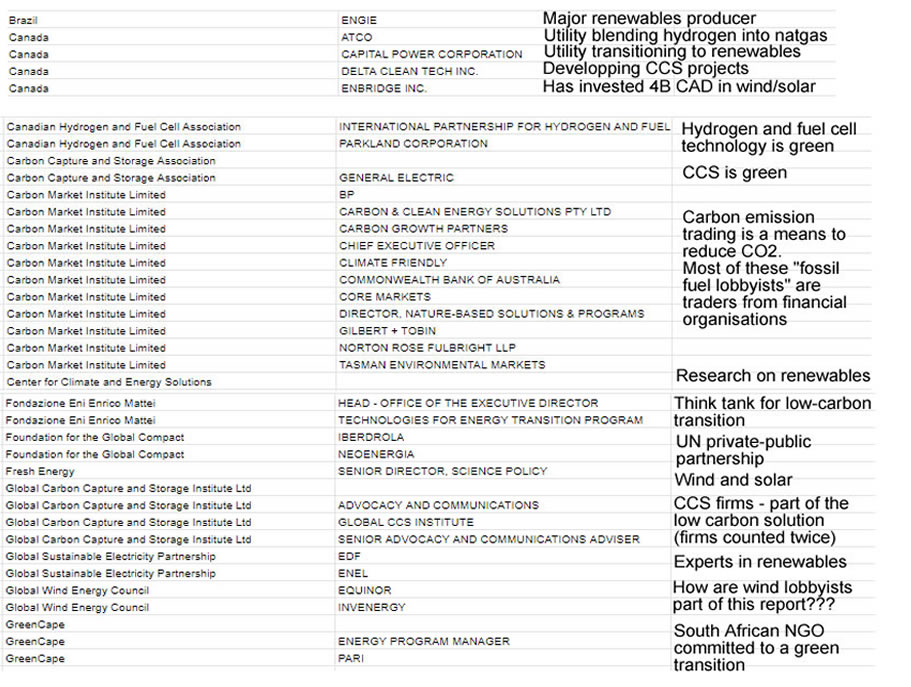 Global Witness, in their report, defined “fossil fuel lobbyists as people who have links to companies with significant business activities in fossil fuels, or who are attending the talks as part of a trade body representing fossil fuel interests.” So that implies that every chamber of commerce or trade association that went to COP27 ticked this zealous, bean-counting box. If Bill Gates had attended, he would have made it onto the “bad guys” list. An energy provider investing heavily in renewables but still using gas generators would be on the list. Somewhere in the wind energy trade associations, there must be a company with some fossil fuel interests. Shame on you!