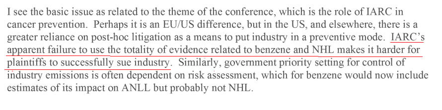The Collegium Ramazzini creates the perfect environment to exact revenge, put entire industries out of business and create short-cuts around the democratic process. Ramazzinians like Bernie Goldstein can thus design processes with US tort law firms to create IARC-crafted evidence to sue companies out of existence (giving it a pseudo-regulatory characteristic by calling it “adversarial regulation”). In an email exchange published by the Risk-Monger, Bernie once even went so far as to demand that IARC go back and produce a third benzene monograph because his tort law firm employers needed a better scientific link between benzene and a common type of cancer (and Ramazzini fellow, Kurt Straif, dutifully complied).