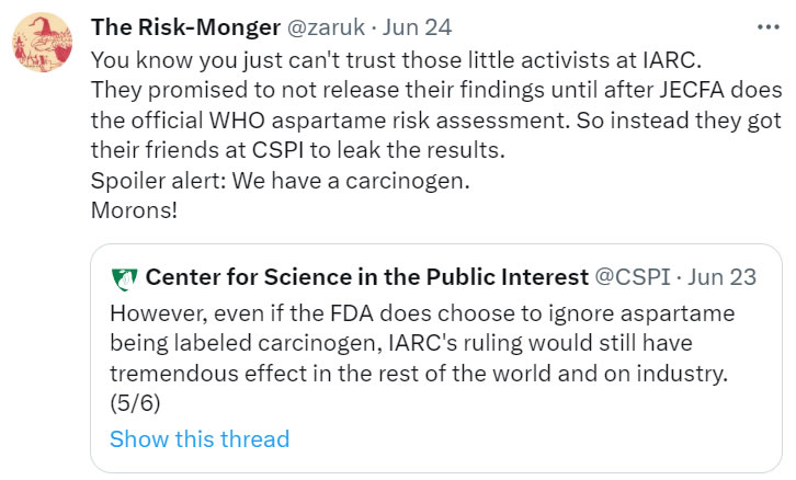 Then I got an email from a journalist from a major American newspaper asking me for an interview. To respect her privacy, I’ll just call her “Bambi”. I had criticised her article from the week before as a “nothing burger in service of anti-aspartame campaigners”. She was curious if I knew who had leaked the IARC results to Reuters. I shared the twitter thread from Peter Lurie, head of the anti-food industry NGO, Center for Science in the Public Interest (CSPI), who had an observer at IARC.