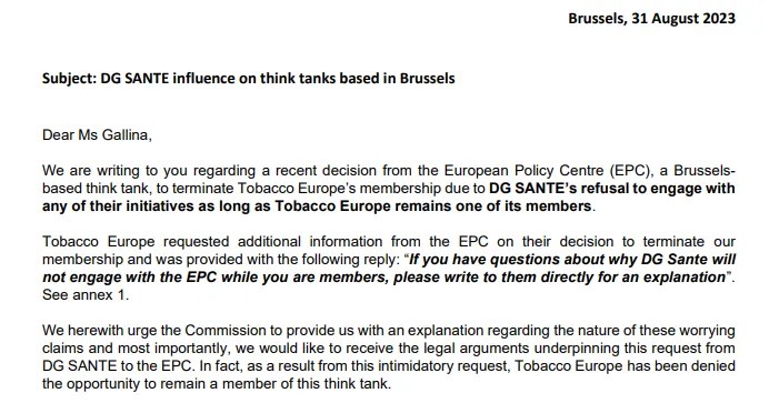 During the summer of 2023, the European Commission informed a Brussels-based think tank, the European Policy Centre (EPC), that if they did not terminate their relationship with Tobacco Europe, then they would be cut out of any European Commission support, cooperation or projects. See the exchanges on this affair and screenshot below. The EPC is a privately-run operation that relies on membership dues to operate. Tobacco Europe, as a trade association representing businesses that operate legally across the European Union, was a passive member of the EPC.