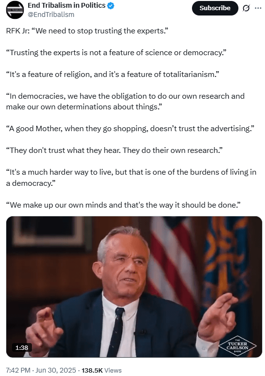 But as RFK Jr digs in, fires all of the credible scientists in HHS institutions and agencies, names his collaborators to advisory panels and boards and shifts research funding to programmes that will meet their political objectives, the classical definition of mainstream science will change in an Orwellian fashion. As the MAHAs take up posts and implement radical policy changes based on their redneck science evidence, how should the traditional scientists react? They have been silenced, defunded and denormalised. Time to move to Europe or China.