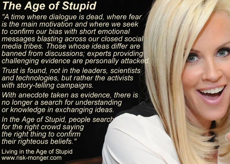 The best way to describe the Age of Stupid is not that there are so many misinformed people, but that we lack the means to hear other views that might correct our own illogic or misinformation. There is no dialogue in an hermetically sealed echo-chamber. If everyone I come in contact with agrees with me, how do I know that the things I believe in are actually correct? How do I know that I am not the stupid one?