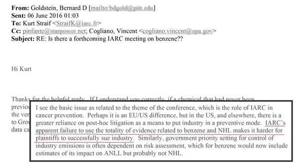 The political spirit purveying through the Collegium Ramazzini culture is that most cancers are caused by exposures to synthetic chemicals and that the companies producing these chemicals must be held liable. The concept of “adversarial regulation” was developed by several IARC / Ramazzini scientists like Bernard Goldstein who believed that the most effective way to enforce change on corporate behaviour is to threaten to sue them out of existence if they do not abandon their practices. Goldstein relied on IARC to produce the evidence his law firms needed. See his exchange with IARC’s head of monographs, Kurt Straif:
